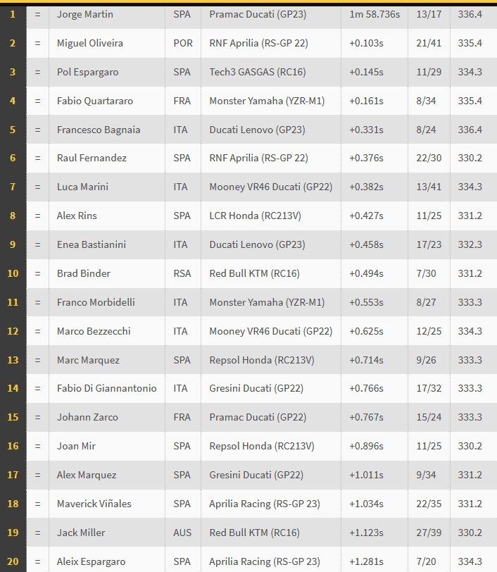 Jorge Martin dari Pramac masih menjadi yang tercepat dan mengungguli Pembalap RNF Aprilia Miguel Oliveira, secara berurutan dibelakang Jorge Martin menyusul pembalap Pol Espargaro dari GASGAS Tech3 dan mantan juara dunia Fabio Quartararo dari Monster Yamaha. Dibelakang Fabio Quartararo menempel juara bertahan dari Ducati, Francesco Bagnaia.